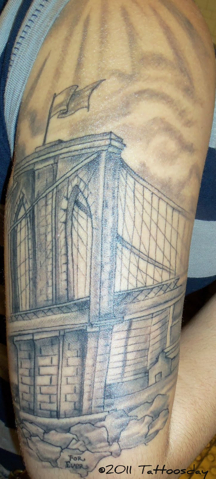 This piece, on her upper right arm, depicts the world-famous Brooklyn Bridge. Mariam explained that the view is from DUMBO (Down Under the Manhattan Bridge Underpass, to you non-New Yorkers).