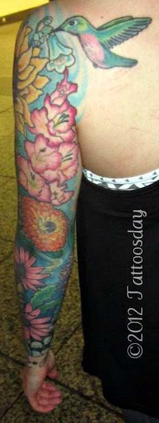 "It's all the birth flowers of the people in my family. The butterfly represents change, the rose represents love, and the hummingbird is for my grandma. The sunflower is for my mom."She estimates that she has spent about 55 hours under the needle for this sleeve.